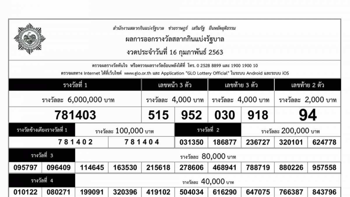 เช็กผลสลากกินแบ่งรัฐบาล อัปเดตจากกองสลาก ตรวจหวย 16 กุมภาพันธ์ 2564 รางวัลที่ 1 รางวัลเลขท้าย 2 ตัว รางวัลเลขหน้า 3 ตัว เลขท้าย 3 ตัว และรางวัลอื่นๆ